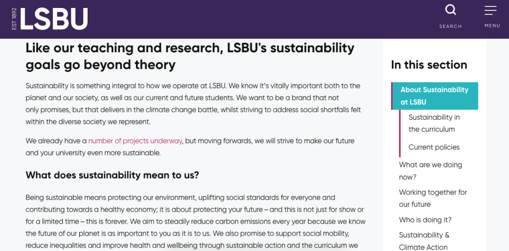 Pretty much everything written during my time at LSBU came through our team, be it social media, marketing copy or website stuff. Here’s an excerpt of the sustainability section I wrote. I led the campaign on refocussing our sustainability goals, ensuring we were sharing our goals, aims and passion in a truthful way. (It’s still live if you want to read it.)